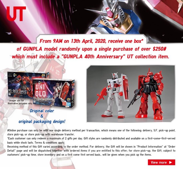 Untuk setiap pencinta Gundam, mulai tanggal 13 April 2020 jam 9AM, setiap pembelanjaan di website Uniqlo HK / Macau di atas HK$250 (harus termasuk salah satu item dari GUNPLA 40th Anniversary collection) dapat gratis 1 GUNPLA model kits dan di atas HK$500 dapat 2.