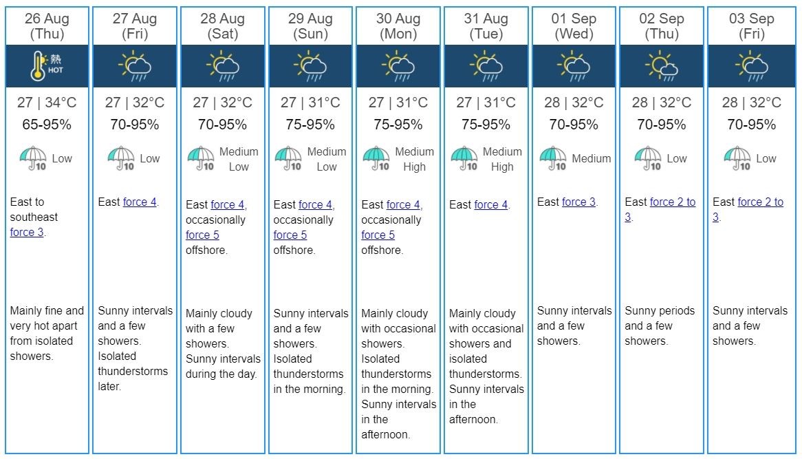 Hong Kong Observatory (香港天文台) mengeluarkan peringatan cuaca sangat panas hari ini (26 Agustus 2021) pukul 06:45 dan diperkirakan suhu tertinggi akan mencapai 34°C. Daerah Tung Chung, Sai Kung, Sha Tin diperkirakan mencapai tertinggi 35°C, Sheung Shui 36°C. Diperkirakan hari ini wilayah Hong Kong cuaca cerah dan kadang-kadang hujan gerimis pada di beberapa area.