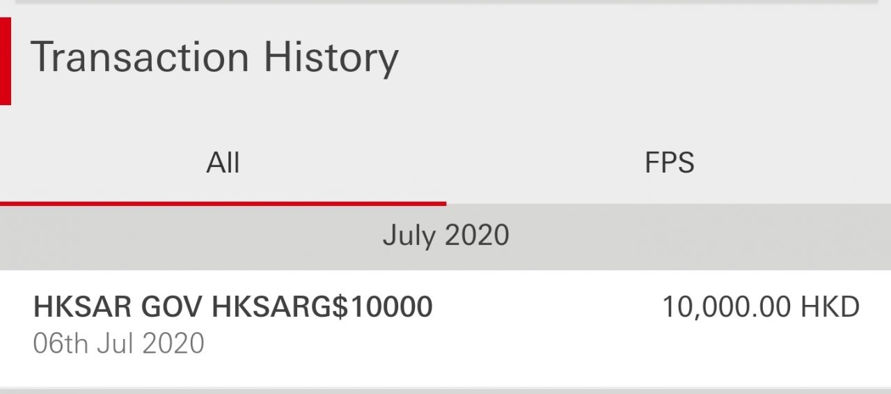 Pemerintah Hong Kong pada awalnya menyatakan bahwa subsidi HK$10,000 untuk setiap penduduk tetap Hong Kong akan mulai dicairkan pada tanggal 8 Juli 2020 tetapi karena sebagian besar penduduk tetap Hong Kong menggunakan e-banking atau formulir elektronik sewaktu melakukan pendaftaran sehingga mempercepat proses pembagian subsidi tersebut, maka pagi hari ini (6 Juli 2020) subsidi tersebut telah mulai dibagikan.