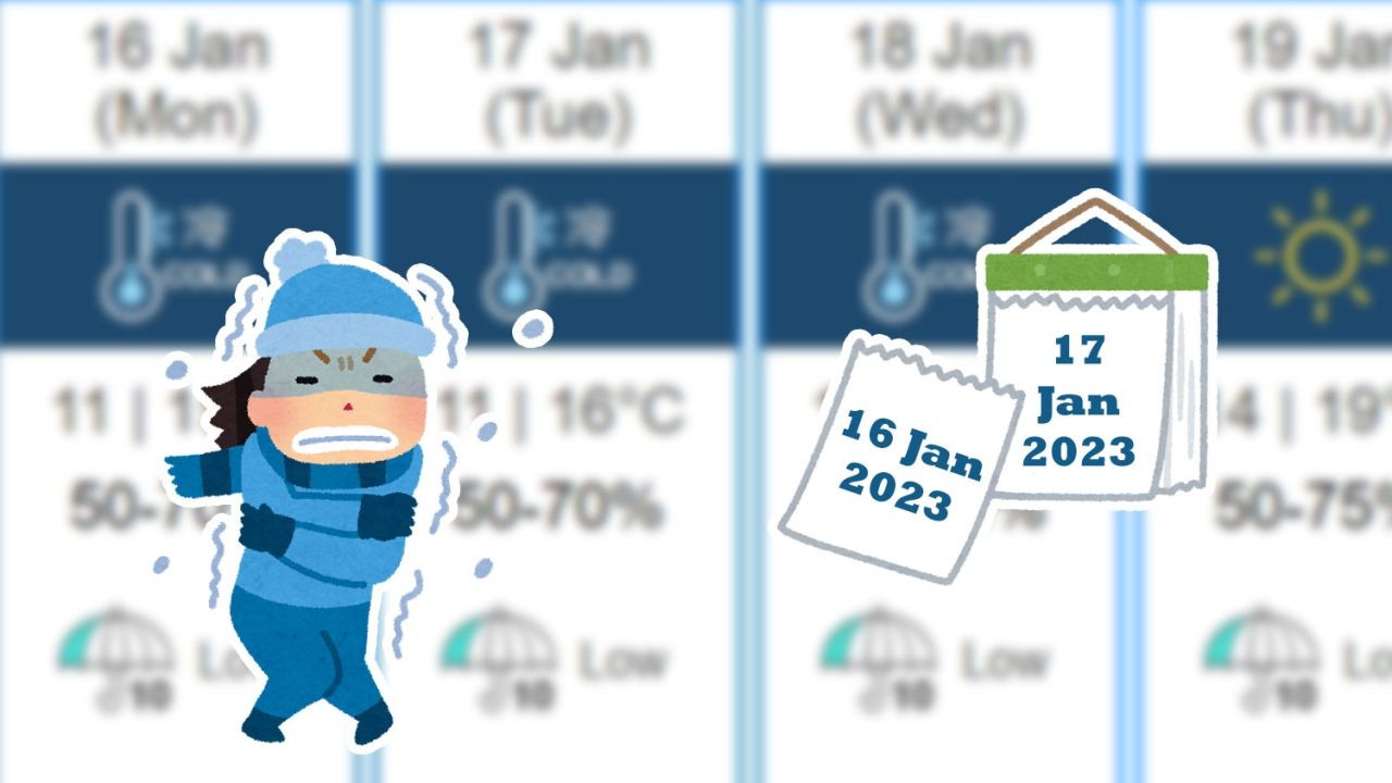 Berdasarkan ramalan cuara dari Hong Kong Observatory, suhu pada hari Senin tanggal 16 Januari 2023 akan mulai menurun dengan suhu rata-rata 11-15°C. Beberapa daerah bahkan turun menjadi 9°C