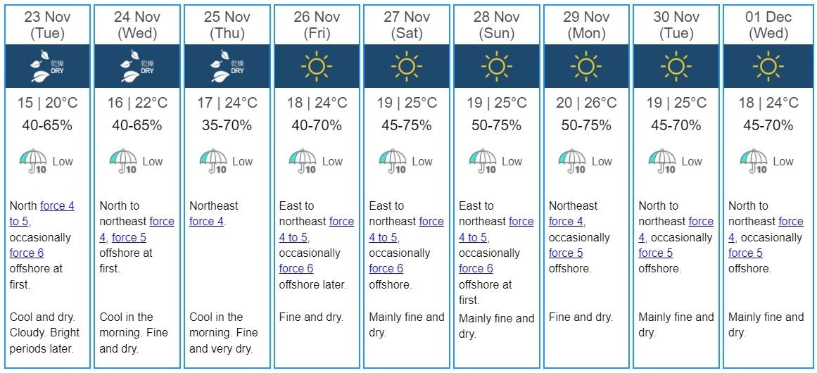 Diperkirakan suhu dingin di daerah Ngong Ping dan Tai Lo Shan akan terus berlangsung selama 3 hari sampai dengan tanggal 25 November 2021.Cuaca Hong Kong 9 hari ke depan adalah cerah dan udara kering dengan kelembaban sekitar 40-75%.