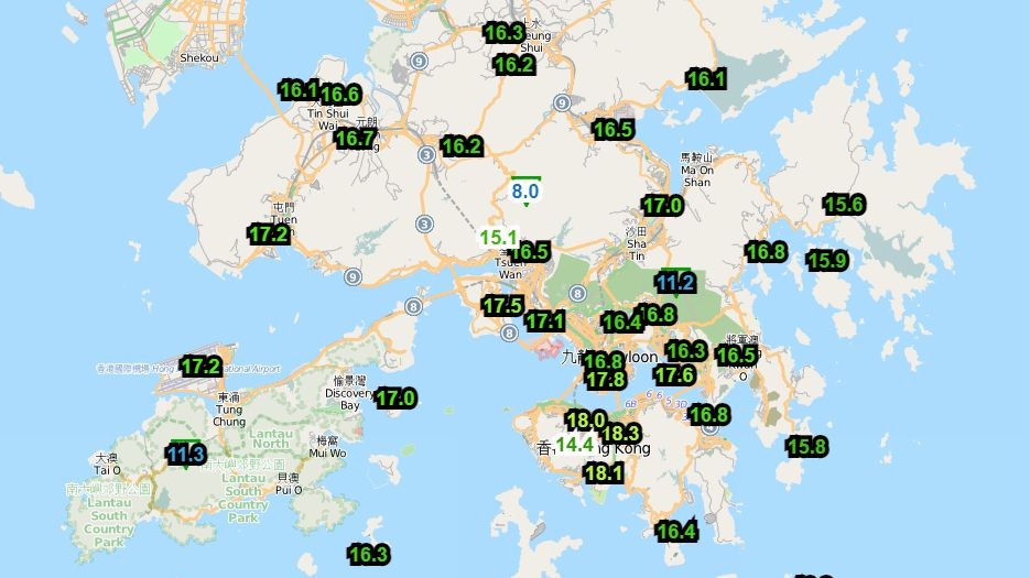 Berdasarkan informasi dari Hong Kong Observatory, suhu di Hong Kong terus menurun malam ini 22 November 2021. Saat ini (20.40) suhu Tai Mo Shan 8°C, Tai Lo Shan 11.2°C dan daerah Ngong Ping saat ini adalah 11.3°C.